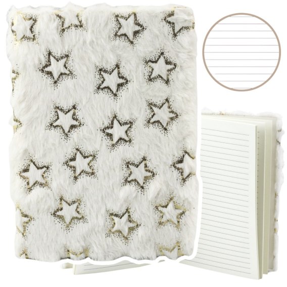 Pluszowy zeszyt w linie z białą okładką pokrytą złotymi gwiazdkami to wyjątkowe połączenie klasyki i blasku. Jego delikatna, puszysta powierzchnia zachwyca przy pierwszym dotyku, a lśniące brokatowe elementy dodają mu wyrazistego charakteru. To zeszyt, który z powodzeniem łączy codzienną funkcjonalność z elegancką, a zarazem bajkową formą.